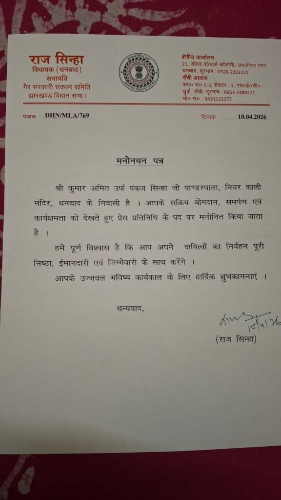 धनबाद(DHANBAD):झारखंड विधानसभा के सचेतक सह धनबाद विधायक राज सिन्हा द्वारा सामाजिक रूप से सक्रिय एवं समर्पित भाजपा के वरिष्ठ नेता कुमार अमित उर्फ पंकज सिन्हा निवासी पाण्डरपाला, काली मंदिर के समीप, धनबाद को प्रेस प्रतिनिधि के पद पर मनोनीत किया गया है।