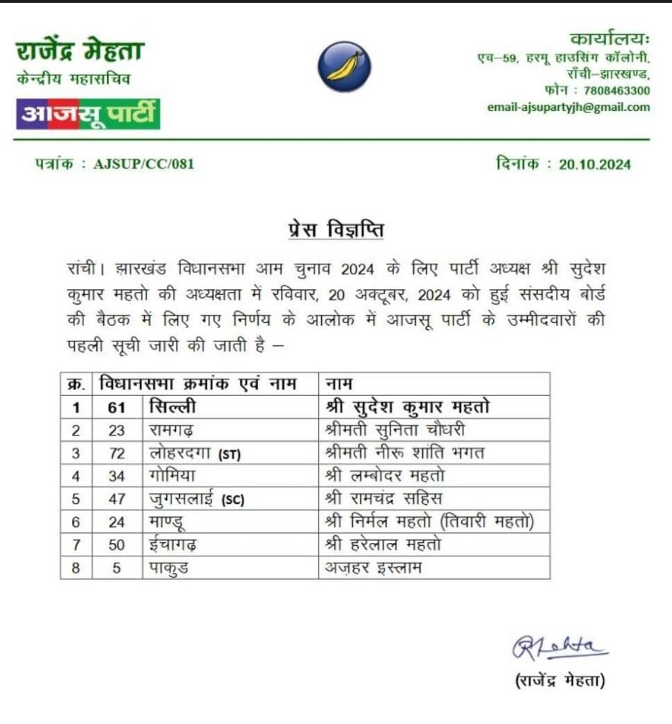 रांची(RANCHI) : झारखंड विधानसभा चुनाव 2024 के लिए आजसू ने भी अपने प्रत्याशियों के नाम की घोषणा कर दी है,एनडीए के दल भाजपा के द्वारा प्रत्याशियों की लिस्ट जारी करने बाद घटक दल भी अब रेस हैं,इसी कड़ी में आजसू पार्टी ने रविवार को अपने प्रत्याशियों की सूची जारी कर दी है।पार्टी द्वारा जारी इस लिस्ट में सिल्ली से आजसू सुप्रीमो सुदेश महतो, रामगढ़ से सुनीता चौधरी, लोहरदगा ने नीरू शांति भगत, जुगसलाई से रामचंद्र सहिस, मांडू से निर्मल महतो उर्फ तिवारी महतो, ईचागढ़ से हरेलाल महतो और पाकुड़ विधानसभा सीट से अजहर इस्लाम आजसू के उम्मीदवार होंगे. इस सूची में डुमरी और मनोहरपुर के उम्मीदवार के नामों की घोषणा अभी नहीं की गयी है जल्द ही उसे भी घोषणा कर देगी..