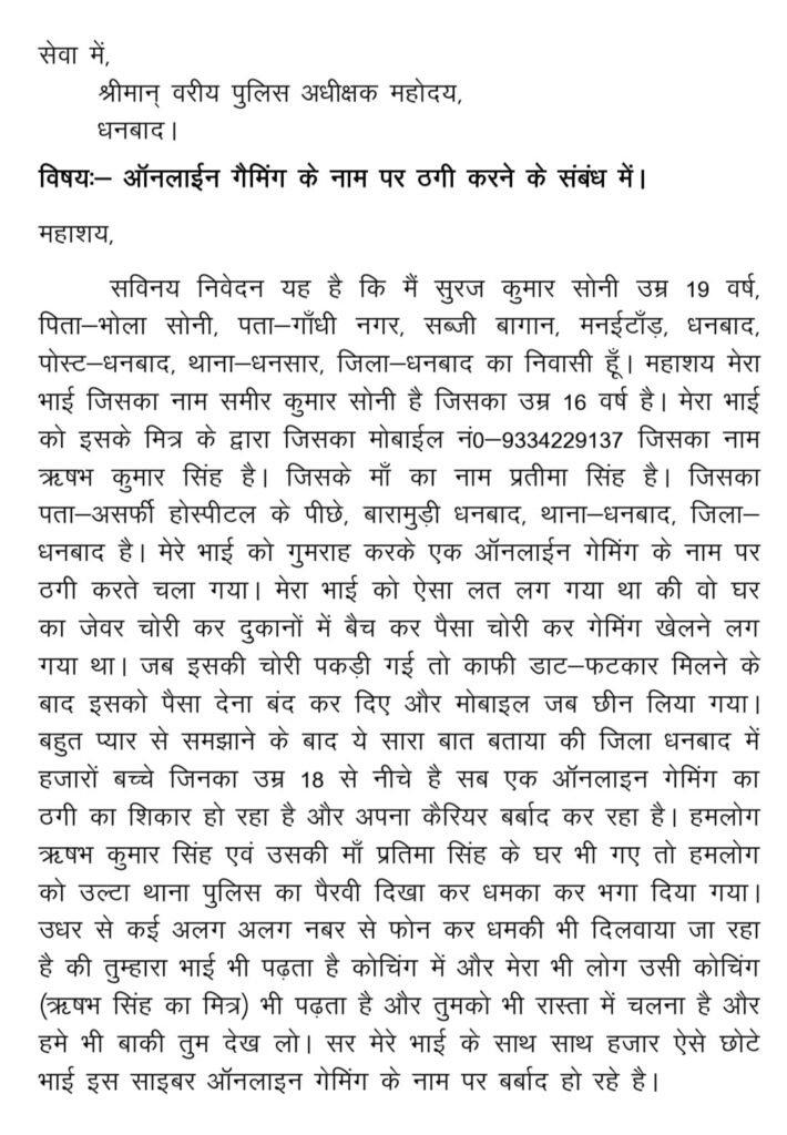 महाशय, मेरा भाई जिसका नाम समीर कुमार सोनी है जिसका उम्र 16 वर्ष है। मेरा भाई को इसके मित्र के द्वारा जिसका मोबाईल नं0-9334229137 जिसका नाम ऋषभ कुमार सिंह है। जिसके माँ का नाम प्रतीमा सिंह है। जिसका पता-असर्फी होस्पीटल के पीछे, बारामुड़ी धनबाद, थाना-धनबाद, जिला-धनबाद है। मेरे भाई को गुमराह करके एक ऑनलाईन गेमिंग के नाम पर ठगी करते चला गया। मेरा भाई को ऐसा लत लग गया था की वो घर का जेवर चोरी कर दुकानों में बैच कर पैसा चोरी कर गेमिंग खेलने लग गया था। जब इसकी चोरी पकड़ी गई तो काफी डांट-फटकार मिलने के बाद इसको पैसा देना बंद कर दिए और मोबाइल जब छीन लिया गया। बहुत प्यार से समझाने के बाद ये सारा बात बताया की जिला धनबाद में हजारों बच्चे जिनका उम्र 18 से नीचे है सब एक ऑनलाइन गेमिंग का ठगी का शिकार हो रहा है और अपना कैरियर बर्बाद कर रहा है।
