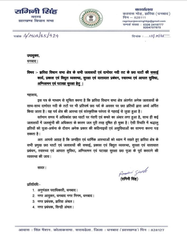 झरिया(JHARIA) : झरिया विधान सभा क्षेत्र में छठ पर्व के अवसर पर जलाशयों और दामोदर नदी तट के छठ घाटों पर श्रद्धालुओं की सुरक्षा और सुविधा सुनिश्चित करने के लिए झरिया विधायक रागिनी ने उपायुक्त को लिखा है। पत्र के माध्यम से अनुरोध किया गया है कि सभी प्रमुख घाटों और जलाशयों की सफाई, प्रकाश एवं विद्युत व्यवस्था, सुरक्षा और यातायात प्रबंधन, स्वास्थ्य एवं आपात सुविधा, अग्निशमन और पटाखा सुरक्षा छठ पूजा से पहले पूरी तरह सुनिश्चित की जाए।
