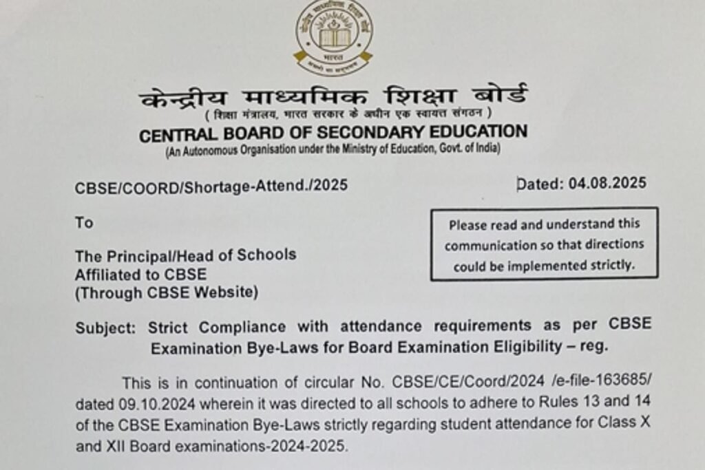 कक्षा 10वीं और 12वीं में पढ़ रहे छात्रों के लिए CBSE ने एक अहम नोटिस जारी किया है। शैक्षणिक सत्र 2025-26 के बोर्ड एग्जाम में शामिल होने के लिए अब कम से कम 75% उपस्थिति अनिवार्य कर दी गई है। यह निर्देश 4 अगस्त 2025 को जारी हुआ है और 9 अक्टूबर 2024 के पुराने सर्कुलर का विस्तार है। बोर्ड का कहना है कि इसका उद्देश्य छात्रों में पढ़ाई की नियमितता और परीक्षा की गंभीरता को बढ़ाना है।