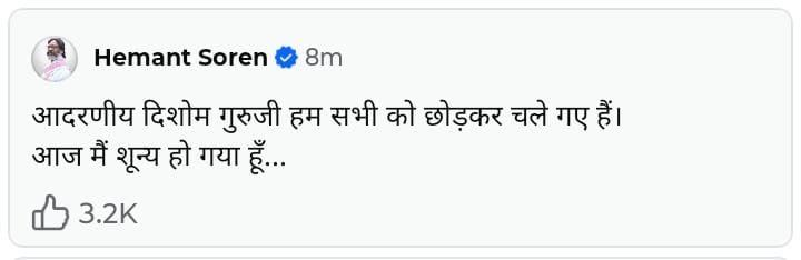 झारखंड(JHARKHAND):झारखंड के पूर्व सीएम शिबू सोरेन का निधन हो गया है, वे लंबे समय से बीमार चल रहे थे। उनके बेटे और झारखंड के सीएम हेमंत सोरेन ने इसकी पुष्टि की।