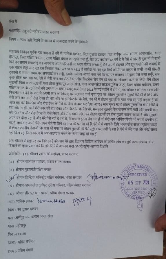 आसनसोल, (ASANSOL)पश्चिम बंगाल, आसनसोल हीरापुर थाना अंतर्गत बुर्णपुर आम बागान के रहने वाले 65 वर्षीय मानिक हलदर ने भारत के राष्ट्रपति सहित प्रधानमंत्री मंत्री, मुख्यमंत्री पश्चिम बंगाल, राज्य्पाल पश्चिम बंगाल, जिलाशासक व आसनसोल दुर्गापुर पुलिस कमिश्नर पश्चिम बर्धमान, को एक पत्र लिखा है…