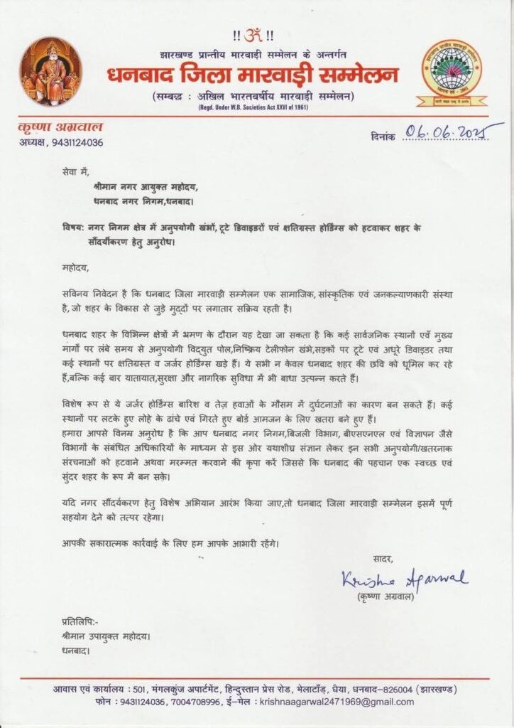 धनबाद जिला मारवाड़ी सम्मेलन के अध्यक्ष कृष्णा अग्रवाल के नेतृत्व में डीसी को सौंपे गए ज्ञापन में निम्नांकित मांग रखी गई है…