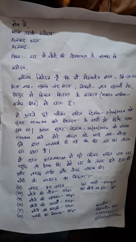 गृहस्वामी विश्वजीत कुमार साव ने बताया कि चोर घर से करीब 9.5 लाख रुपये नकद और सोने-चांदी के आभूषण समेत लगभग 2 करोड़ रुपये की संपत्ति लेकर फरार हो गए। उन्होंने इस संबंध में धनबाद थाना में लिखित शिकायत दर्ज कराई है।