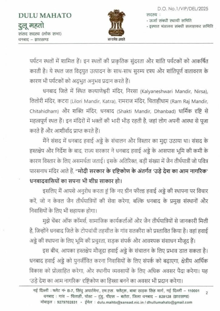 धनबाद(DHANBAD):धनबाद सांसद ढुल्लू महतो ने गुरुवार को संसद के सत्र के दौरान प्रधानमंत्री नरेंद्र मोदी से मुलाकात की और उन्हें धनबाद के राम राज मंदिर से जुड़े स्मृति चिन्ह और शॉल भेंट की ..वही सांसद ढुल्लू महतो की पत्नी सावित्री देवी ने चिटाहीधाम से ले गई राखी को भेंट करते हुए रक्षा बंधन के दिन इसे बांधने का आग्रह किया..मौके पर सांसद ढुल्लू महतो ने देश की कोयला राजधानी धनबाद में एयरपोर्ट की जरूरत को बताते हुए एक मांग पत्र सौंपा.. जिसमे उन्होंने धनबाद के आर्थिक विकास के लिए एयर पोर्ट का होना जरूरी बताया..साथ ही पर्यटन विकास ,केंद्रीय उपक्रम,देश की प्रतिष्ठित संस्थान IIT- ISM, सिंफर,hurl, डीवीसी,बीसीसीएल आदि के होते हुए धनबाद में एयरपोर्ट के अभाव में विकास ठप्प होने से अवगत कराया..साथ ही पीपीपी मोड पर धनबाद में एयरपोर्ट को शुरू करने की मांग.. सांसद ने अपने सोशल मीडिया पोस्ट पर भी उक्त जानकारी साझा किया है…