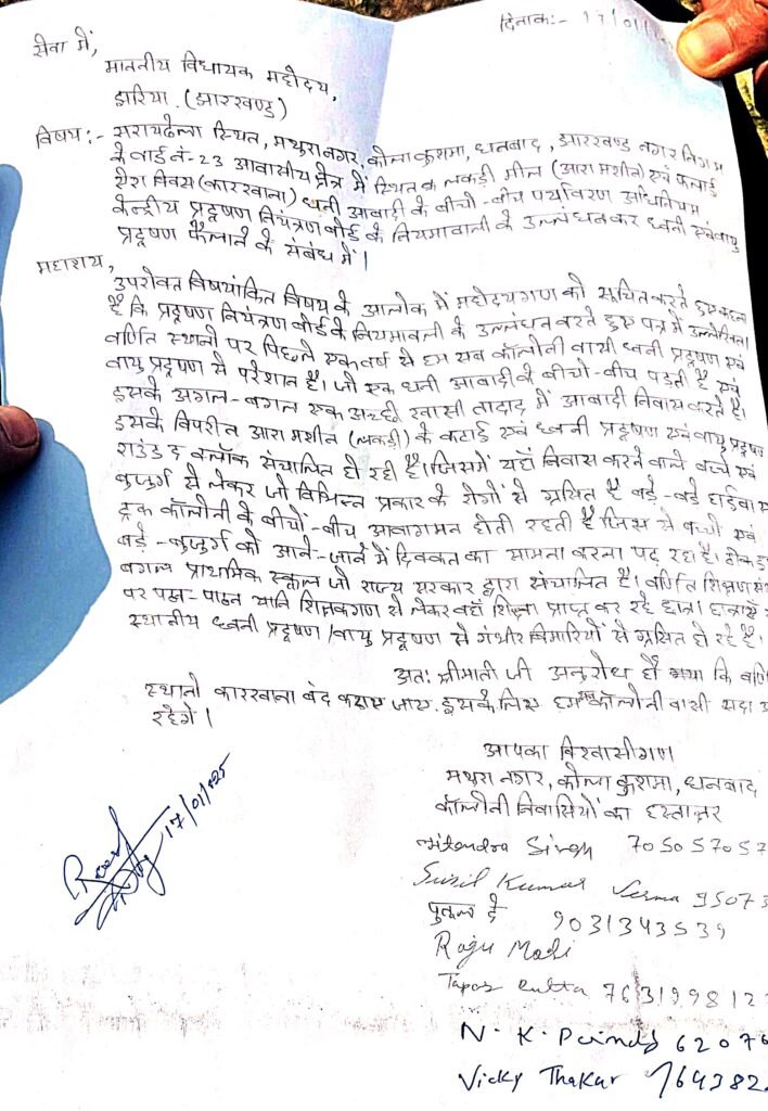 ग्रामीणों ने बताया की प्रदूषण नियंत्रण बोर्ड के नियमावली का उल्लंघन करते हुए कोला कुसमा स्थित मथुरा नगर में लकड़ी मील (आरा मशीन) एवं फ्लाई ऐश ब्रिक्स कारखाना चलाया जा रहा है जिससे आये दिन ध्वनि एवं वायु प्रदुषण के चपेट में लोग तरह तरह के गंभीर विमारी से प्रभावित हो रहें हैं। जिसको लेकर ग्रामीणों ने झरिया विधायक रागिनी सिंह को लिखित शिकायत के माध्यम से अवगत कराया है..