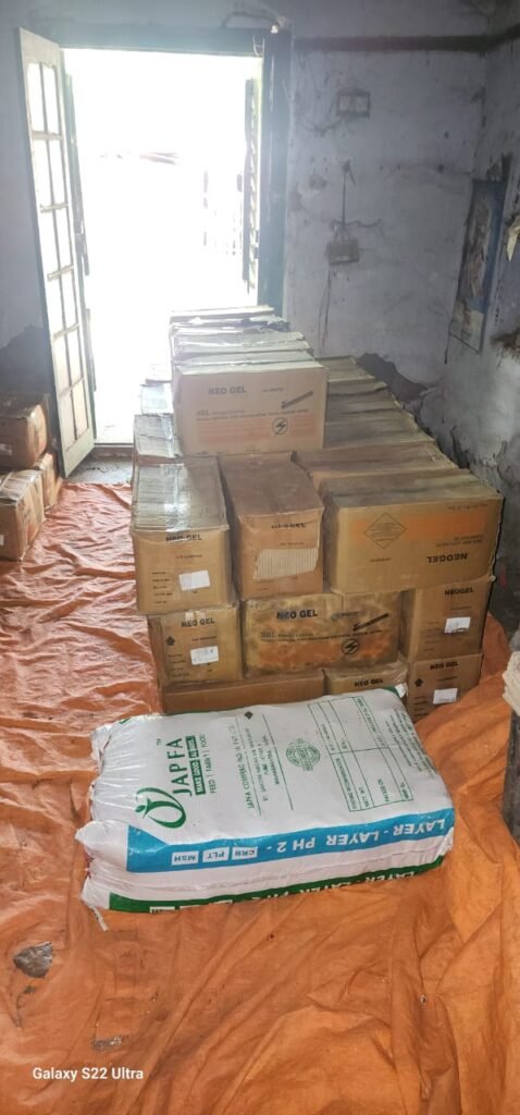 पाकुड़(PAKUD):पाकुड़ में वरीय पुलिस अधिकारी को मिली गुप्त सुचना पर पाकुड़ पुलिस ने बड़ी कार्रवाई किया है…पुलिस ने टीम गठित कर छापेमारी कर भारी मात्रा में विस्फोटक का जखीरा जब्त किया है…पुलिस ने यह कार्रवाई जिले के पाकुड़िया थाना क्षेत्र के डोमनगाड़िया स्थित एक घर में किया है…एसडीपीओ विजय कुमार ने बताया की पाकुड़िया थाना क्षेत्र स्थित एक घर से यह विस्फोटक बरामद किया गया है…सभी विस्फोटक पेटी में है…बताया जा रहा दर्जनों काटून पेटी में विस्फोटक का जखीरा है…साथ ही पुलिस ने एक व्यक्ति को गिरफ्तार है…गिरफ्तार व्यक्ति का नाम शमशुल हसन बताया जाता है…पुलिस फिलहाल जाँच में जुटी है…छापेमारी कर भारी मात्रा में विस्फोटक सामग्री में जिलेटिन, डेटोनेटर,इत्यादि बरामद किया है…छापेमारी के दौरान पुलिस ने एक व्यक्ति को गिरफ्तार कर पूछताछ कर रही है…अमूमन इस इलाके में इस तरह के विस्फोटक पत्थर खदान में पत्थर उतखान्न के लिए किया जाता है…फिलहाल पुलिस पुरे मामले की जाँच में जुटी है…