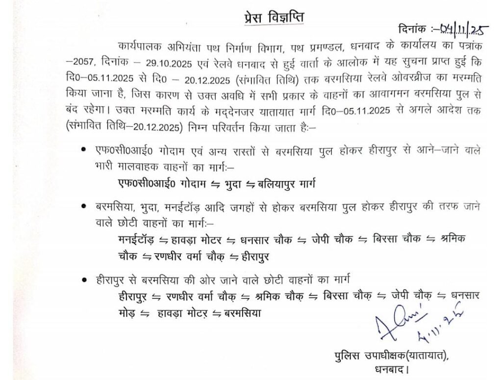 जिस कारण से कल से सभी प्रकार के वाहनों का आवागमन बरमसिया पुल से बंद रहेगा। उक्त मरम्मति कार्य के मद्देनजर यातायात मार्ग दि०-05.11.2025 से अगले आदेश तक (संभावित तिथि-20.12.2025) निम्न परिवर्तन किया जाता है:-