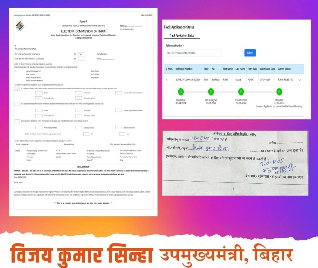 30 अप्रैल 2024 को ऑनलाइन विलोपन फॉर्म भरा, लेकिन 27 जून 2024 को प्रशासनिक कारण से रिजेक्ट हो गया। इसके बाद BLO को बुलाकर लिखित आवेदन दिया और उसकी रसीद मेरे पास है। पिछली बार भी मैंने केवल लखीसराय से ही वोट डाला था और इस बार भी वही किया है।