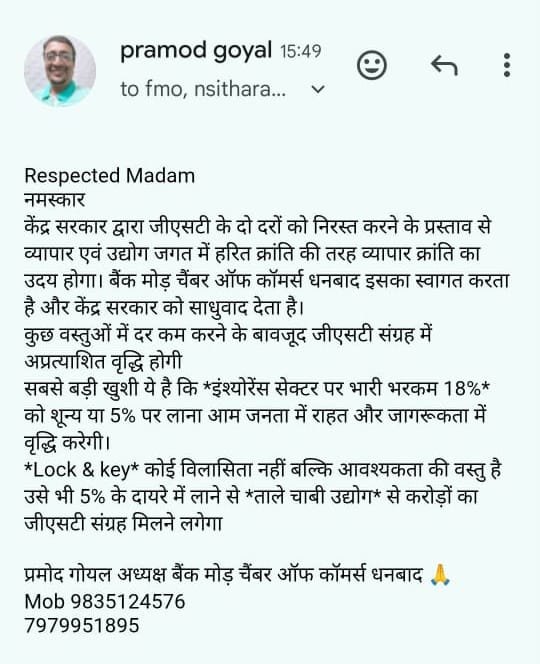 Lock & key कोई विलासिता नहीं बल्कि आवश्यकता की वस्तु है उसे भी 5% के दायरे में लाने से ताले चाबी उद्योग से करोड़ों का जीएसटी संग्रह मिलने लगेगा .. वित मंत्री को भेजे गए मेल की कॉपी में बैंक मोड़ चैंबर अध्यक्ष प्रमोद गोयल ने सरकार के GST कर सुधार के दिशा में उठाए गए नए कदम का स्वागत भी किया..