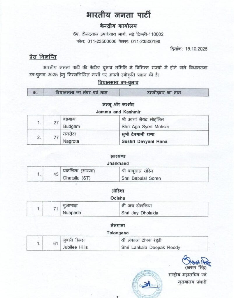 नई दिल्ली(NEW DELHI): भारतीय जनता पार्टी (भाजपा) ने विधानसभा उपचुनाव 2025 के लिए अपने उम्मीदवारों की पहली सूची जारी कर दी है। पार्टी की केंद्रीय चुनाव समिति ने बुधवार को विभिन्न राज्यों की सीटों पर उम्मीदवारों के नामों को अंतिम रूप दिया। भाजपा के राष्ट्रीय महासचिव (संगठन) की ओर से जारी प्रेस विज्ञप्ति के अनुसार, पार्टी ने जम्मू-कश्मीर, झारखंड, ओडिशा और तेलंगाना में होने वाले उपचुनावों के लिए अपने प्रत्याशियों की घोषणा की है।