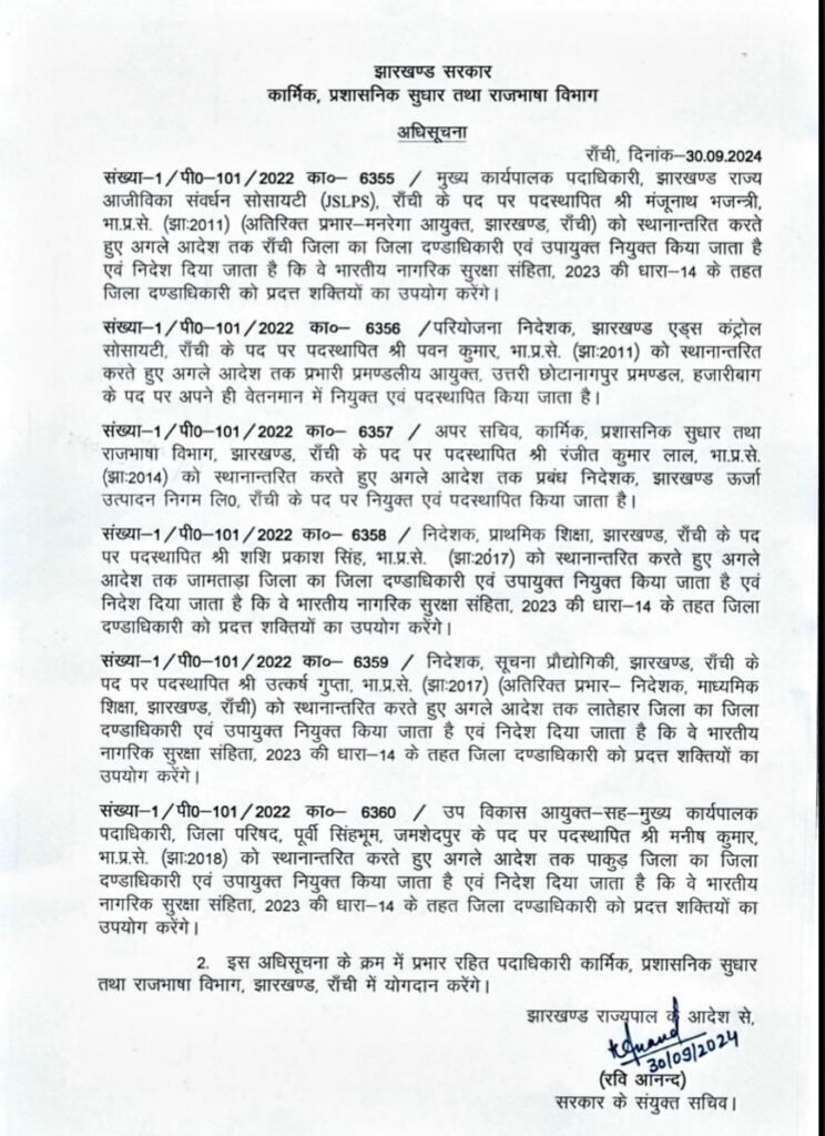 इसके अलावा AIDS कंट्रोल के परियोजना निदेशक पवन कुमार को उत्तरी छोटानागपुर प्रमंडल का प्रभारी प्रमंडलीय आयुक्त और कार्मिक विभाग के अपर सचिव रंजीत कुमार लाल को JBVNL का प्रबंधन निदेशक बनाया गया है. कार्मिक विभाग ने इससे संबंधित अधिसूचना जारी कर दी है…