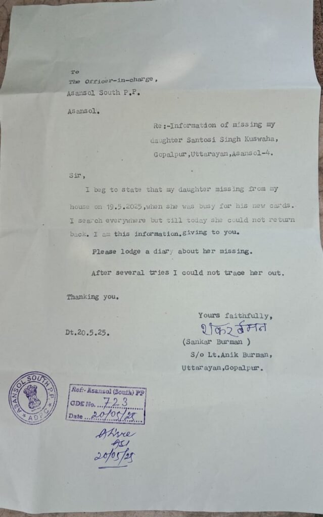 आसनसोल,(ASANSOL): पश्चिम बंगाल आसनसोल के साऊथ पुलिस फाड़ी अंतर्गत गोपालपुर इलाके की रहने वाली 36 वर्षीय शांतोषी सिंह कुशवाहा पिछले दस दिनों से रहस्यमय ढंग से लापता है, शांतोषी के पति प्रेम चंद कुशवाहा अपनी पत्नी की गुमशुदगी की लिखित शिकायत आसनसोल साऊथ पुलिस फाड़ी मे 20,05,2025 को किये हैं, जिसमे उन्होंने यह लिखा है की उनकी पत्नी शांतोषी सिंह कुशवाहा 19,05,2025 को दोपहर 1:15 मिनट पर आसनसोल शिविल डिफेन्स बिल्डिंग मे स्वास्थ्य साथी कार्ड करेक्शन करवाने गई थी घर से निकलने के करीब एक घंटे के बाद संतोषी का मोबाईल ऑफ हो गया, संतोषी के तीन बच्चे हैं, जिसमे 16 वर्षीय जिया कुशवाहा, 13 वर्षीय जानवी कुशवाहा और एक 6 वर्षीय बेटा जय कुशवाहा है, संतोषी ने आखरी बार अपने बच्चों को यह कहा था की वह स्वास्थ्य साथी कार्ड करेक्शन करवाकर जल्द घर वापस आ रही है, जिसके बाद वह अपने बच्चों के साथ मिलकर खाना खाएगी संतोषी के तीनो बच्चे अपनी माँ के साथ खाना खाने का इंतजार करते रहे पर संतोषी वापस घर नही आई संतोषी के तीनो बच्चे अपनी माँ को फोन करने लगे पर फोन ऑफ होने के कारन उनका उनकी माँ से बात नही हो सका जिससे बच्चे और घबरा गए और घटना की जानकारी अपने पिता प्रेम चंद कुशवाहा को दी, प्रेम अपना सारा काम छोड़ अपनी पत्नी को ढूंढने मे जुट गए, उन्होंने अपने दोस्तों और सगे सम्बंधियों से सम्पर्क साधा और अपनी पत्नी की तलाश की पर वह अपनी पत्नी को ढूंढने मे असफल रहे, जिसके बाद वह थक हार के 20,05,2025 को आसनसोल साऊथ पुलिस फाड़ी पहुँचे जहाँ उन्होंने पुलिस को अपनी पत्नी की गुमशुदगी होने की पूरी घटना बताई, पुलिस ने प्रेम के कहने के अनुसार उनकी पत्नी संतोषी की गुमशुदगी की शिकायत तो दर्ज कर ली पर दस दिनों के बाद भी पुलिस संतोषी को ढूंढ़ नही सकी, प्रेम अपनी पत्नी को पाने के लिये अपने सोसल अकाउंट के जरिये अपनी पत्नी और अपने तीनो बच्चों के साथ फोटो अपलोड कर अपनी वीरान और उजड़ रहे परिवार का दुख बयां कर रहे हैं, यह सोंचकर की उनके पोस्ट के जरिये उनकी पत्नी उनको मिल जाए और उनको हँसता खेलता परिवार दोबारा बस जाए, इसके अलावा प्रेम अपने तीनो बच्चों को लेकर कई बार थाने का चक्कर काट चुके हैं, पुलिस कर्मियों से अपनी पत्नी को ढूंढने के लिये गुहार लगा चुके हैं बावजूद उसके उनकी पत्नी अबतक उनको नही मिल पाई है, इसके अलावा प्रेम अपनी पत्नी को ढूंढने के लिये बंगाल सहित अन्य राज्यों मे रह रहे अपने सगे और सम्बंधियों सहित अपने रिश्तेदारों के घर का दौरा भी कर रहे हैं.