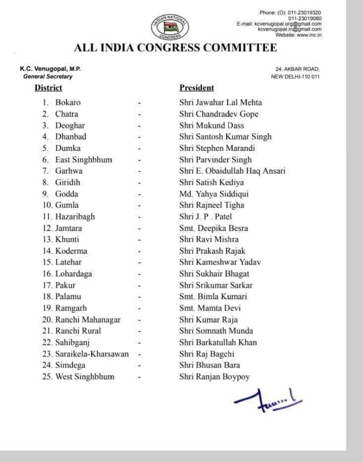 केसी वेणुगोपाल ने झारखंड के सभी जिलों में संगठन सृजन अभियान के तहत नए जिलाध्यक्षों की नियुक्ति को मंजूरी दी है। धनबाद के वर्तमान जिलाध्यक्ष संतोष कुमार सिंह को फिर से अध्यक्ष बनाया गया है। पार्टी ने इसकी सूची जारी कर दी है। लोहरदगा में सुखेर भगत रांची महानगर में कुमार राजा समेत कई जिलाध्यक्षों को फिर मौका मिला है।